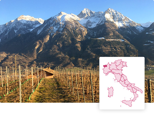 La Valle d’Aosta con poco più di 460 ettari vitati complessivi, dei quali oltre la metà a denominazione di origine, con una produzione enologica che raggiunge lo 0,1% di quella nazionale, rappresenta uno scrigno ricco di tradizioni e peculiarità con una straordinaria ricchezza viticola ed enologica.